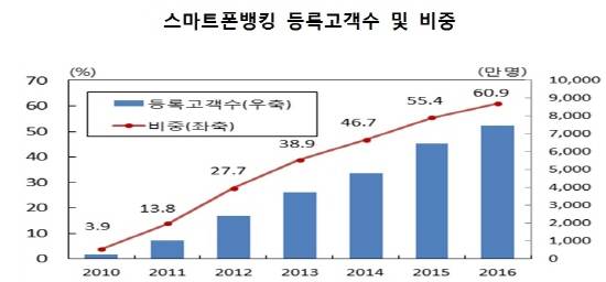 실제로 스마트폰기반 모바일뱅킹 등록고객 수가 7468만명으로 전년말 대비 15% 늘어나 전체 인터넷뱅킹 등록고객 수에서 차지하는 비중이 61% 수준으로 상승했다.