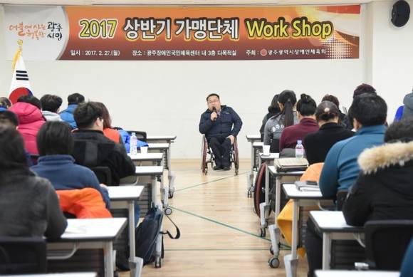 [프라임경제] 광주장애인체육회(회장 윤장현 광주광역시장)가 27일 장애인국민체육센터 3층 다목적실에서 본회 임직원, 가맹단체 실무자, 생활체육클럽매니저 등 100여 명이 참석한 가운데 '2017년도 가맹단체 혁신·역량 강화를 위한 하반기 워크숍'을 진행했다.
