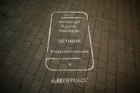 그린피스는 스마트폰 출시 10주년을 맞아 '수리 ·재활용이 쉽도록 다시 디자인하라 (Redesign Repair Recycle)'는 문구가 담긴 대형 스마트폰을 MWC 행사장 반경 1㎞ 바닥 곳곳에 그려 방문객들의 이목을 끌었다.