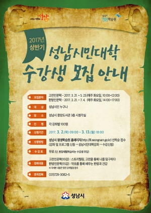 [프라임경제] 성남시(시장 이재명)는 오는 3월2일부터 13일까지 '2017년 상반기 성남시민대학' 수강생 200명을 모집한다. 시민대학은 고전 인문학과 한방 인문학의 2개 강좌가 마련되며, 강좌별 100명의 시민이 각 교육과정에 참여할 수 있다.