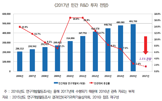 조사 결과, 올해 민간 R&D 투자는 전년대비 1.5% 증가할 것으로 전망됐다. 이는 자료가 부재한 지난해를 제외한 최근 10년 가운데 가장 낮은 증가율이다.