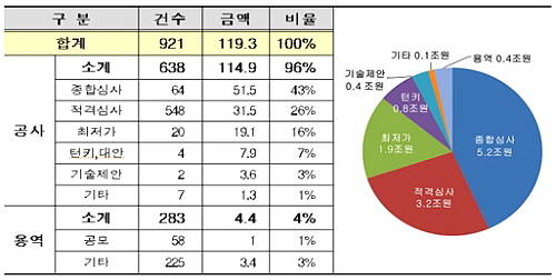 공공별로는 일자리창출 등 경제적 파급효과가 큰 건축 및 토목공사가 각각 7조2000억원, 2조원이며 그 외 전기·통신공사가 1조7000억원, 조경공사가 4000억원에 이른다.
