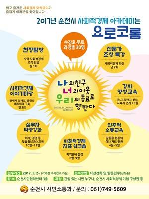 [프라임경제] 전남 순천시는 2017년 사회적경제 아카데미 주제를 '나의 친구, 너의 이웃, 우리의 동료로 향한다'로 정하고, 협력과 협동으로 사회적경제 생태계 구축을 위한 아카데미를 실시한다.