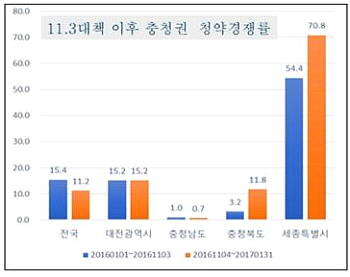 여기에 11·3 부동산대책에 따른 청약과 대출규제 등에도 세종시의 청약경쟁률은 지난 2016년 11월3일 이후 평균 70%대 1로, 같은 기간동안 대전시 15.2대 1, 충남 0.7대 1보다 높다.