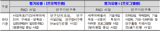 평가유형Ⅰ(프로젝트형)은 기존 기술성평가와 동일하게 '사업계획의 구체성'을 중심으로 평가하며, 신설된 평가유형Ⅱ(프로그램형)는 사업의 국가정책적 필요성, 시급성, 파급효과를 중심으로 가중치를 부여해 평가한다.