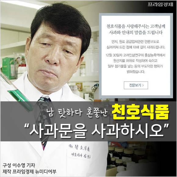 이는 천호식품의 기업관에 어울리지 않는 사과문을 비판하면서 '올바른 사과'의 다섯 가지 원칙을 꼬집는 내용이었다. 천호식품 측 반론을 담으려 했지만 당시 회사 관계자들은 취재에 제때 응하지 않았다.