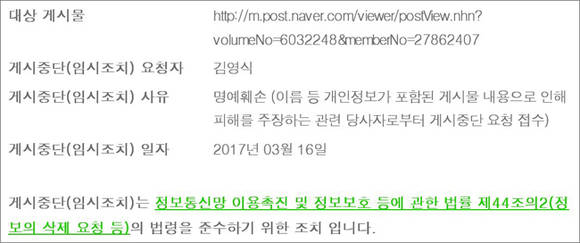 이에 김 회장은 2개월 넘게 흐른 지난 16일 오후 해당 포스팅에 대해 게시금지 요청을 했고 네이버(035420) 측은 이를 받아들였다. 이유는 '(실명이 거론된) 명예훼손'이었다.
