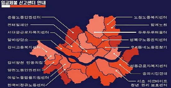 그 시작으로 서울시는 1월17일부터 3월31일까지 아르바이트를 하고 돈을 받지 않은 피해들을 신고하는 기간으로 정하고, 자기가 살고 있는 구청의 노동복지센터 및 노동단체 17개를 '아르바이트 임금체불 신고센터'로 정해 놓고 운영을 한다고 밝혔어요.