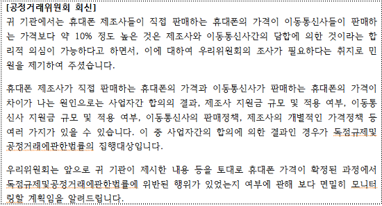 공정위는 "사업자 간의 합의에 의한 결과인 경우가 독점규제 및 공정거래에관한법률의 집행대상"이라며 "제조사와 이동통신사가 판매하는 휴대전화 가격의 차이 원인으로는 제조사와 이동통신사 지원금 규모 및 적용 여부, 이동통신사의 판매정책, 제조사의 가격정책 등 다른 이유도 있기 때문"이라고 설명했다.