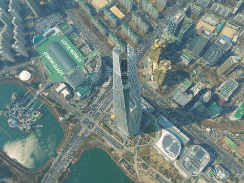 [프라임경제] 국내 최고층 건물 서울 잠실 롯데월드타워가 내달 3일 문을 여는 가운데, 드론이 상공에서 건물 일대를 촬영, 롯데월드타워의 위용을 포착했다.