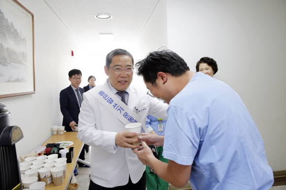 참석자들은 '따뜻한 말 한마디 하루가 행복해집니다', '존중과 관심의 표현으로 먼저 인사합니다'라고 씌여진 어깨띠를 착용하고서 수술을 마치고 나오는 의료진에게 음료수를 건네며 격려했다.