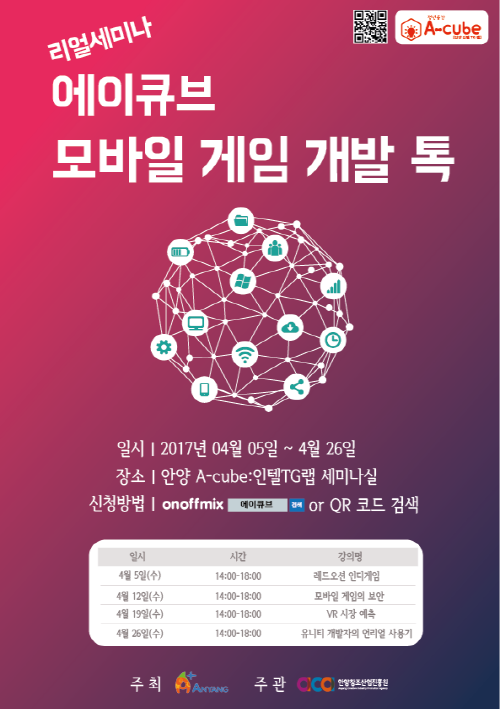 먼저 행사기간 동안 매주 수요일 오후 2시부터 6시까지 총 4회에 걸쳐 '에이큐브 리얼세미나:모바일 게임 개발 톡'을 통해 게임개발과 관련한 노하우를 전문가와 참가자의 공유 토론 형식으로 진행한다. 조이맥스, 링크투모로우 등 국내 주요 게임개발사가 참여하며 '윈드러너' '캔디팡' 등 인기 모바일 게임 개발자인 하나용씨가 강사로 나선다. 토론 주제는 △레드오션 인디게임을 시작으로 △유니티 개발자의 언리얼 엔진 사용기 △VR 시장 예측 등 다양한 주제를 다룰 예정이다.