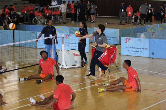 ODA 사업으로 지급된 새로운 장비를 체험한 캄보디아 선수들의 입가에는 미소가 사라지지 않는다. 더운 날씨에 바닥을 쓸며, 움직이는 좌식배구 선수들의 얼굴에 땀방울이 생글생글 흘러 내리지만, 10분간의 휴식시간도 그들의 열정을 쉬게하지 못했다.