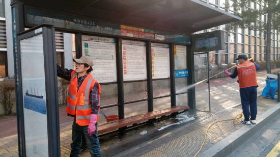 이번 청소는 지난 20일부터 시작돼 미세먼지와 매연을 덮어쓴 버스 쉘터 지붕, 의자, 바닥을 2대의 고압 살수차로 물청소하고, 주변의 불법 광고물을 떼어 낸다. 성남시는 승강장에 세워진 672개 버스 도착 정보안내 단말기 정비를 병행한다.