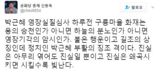 29일 신 총재는 구룡마을에서 일어난 화재 이후 자신의 트위터에 "박근혜 영장실질심사 하루 전 구룡마을 화재는 용의 승천인가 아니면 하늘의 분노인가 아니면 영장기각의 암시인가"라고 썼다.