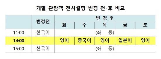 또한 개별 관람객에 대해서도 매일 두 차례(오전 11시, 오후 3시) 한국어로 전시설명을 하고 있다.