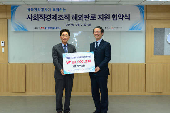 [프라임경제] 한국전력(사장 조환익)은 31일 고려대학교 산학관에서 사회적 경제조직 해외판로 지원 협약식을 열고, 사회연대은행에 후원금 1억원을 전달했다.