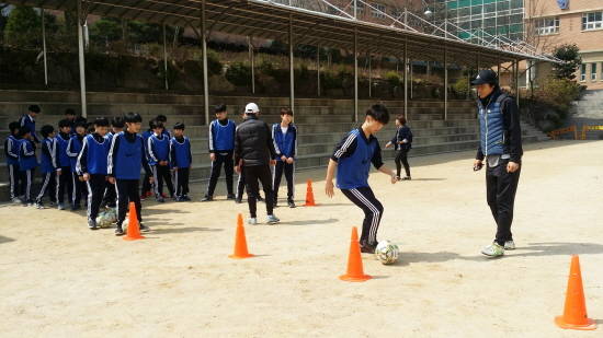 [프라임경제] 용인시축구센터(이사장 정찬민)는 지난 4일 수지구 죽전동 소재 현암 중학교 스포츠 동아리(축구, 농구, 족구) 학생 76명을 대상으로 드리블, 헤딩, 슈팅, 패스 등 축구의 기본기를 축구센터 지도자들이 전수하는 축구클리닉 재능기부 활동을 펼쳤다.