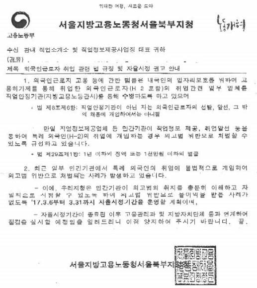 지난달 초 고용부 각 지청은 직업소개소 사업자들에게 '외국인근로자 취업 관련 법 규정 및 자율시정 권고 안내 공문'을 발송했다. 주 내용은 외국인근로자 고용 등에 관한 법률(이하 외고법)에 따라 민간 직업정보제공 및 알선업체가 외국인 취업에 개입하면 처벌한다는 내용이다.