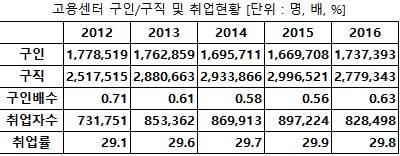 고용부에서 운영하는 고용센터는 전국적으로 89곳이 있으며 2016년 277만9343명의 구직자 중 82만 8498명을 취업시켰다. 이는 29.8%의 취업률로 국내 구직수요를 전혀 충당하지 못하는 실정이다.