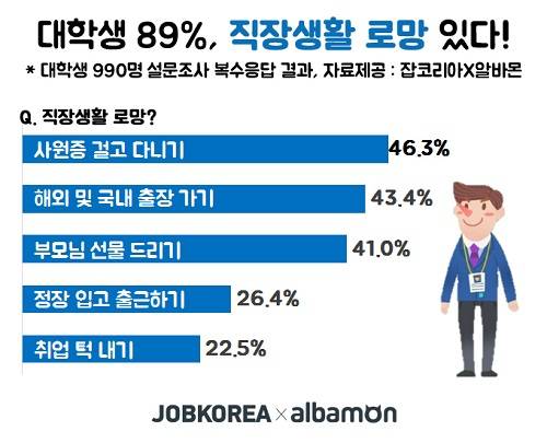 잡코리아와 알바몬은 설문조사를 통해 대학생들의 직장생활 로망에 대해 복수응답으로 조사한 결과 '사원증 걸고 다니기(46.3%)'와 '해외 및 국내 출장 가기(43.4%)'가 각각 1·2위로 선정됐다.