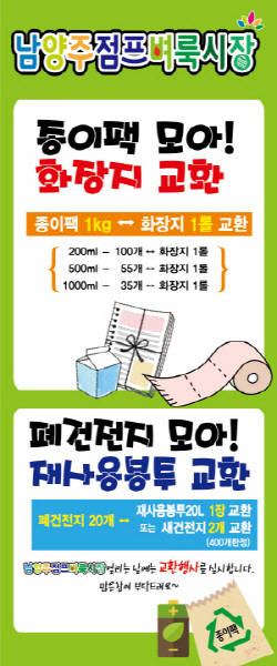 특히 남양주시는 종이팩이나 폐건전지․폐형광등의 재활용률을 높이기 위해 4월부터 10월까지 매주 토요일에 열리는 시민주도 나눔장터인 '남양주점프벼룩시장'과 연계해 '자원재활용 활성화사업' 홍보부스를 마련하고 특별 캠페인을 펼칠 계획이다.
