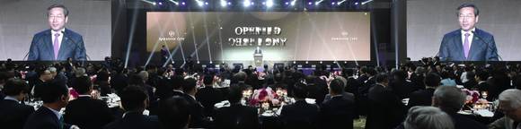 [프라임경제] 유정복 인천광역시장이 20일 인천 중구 파라다이스 시티에서 열린 '파라다이스 복합리조트 오픈식'에서 축사를 하고 있다.