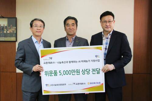 교촌에프앤비 관계자는 "국내 대표 치킨 프랜차이즈로서 AI 피해농가에게 의미 있는 나눔을 전하고자 이번 기부를 결정했다"며 "소외된 이웃에 대한 관심을 높일 수 있는 계기가 되길 바란다"고 말했다.