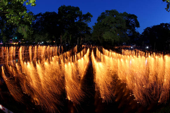 참나무로 만든 숯가루를 한지에 넣어 꼬아 만든 수천 개의 낙화봉을 줄에 매달아 불을 붙이면 타들어가는 숯가루가 붉은빛을 발하며 꽃가루처럼 연못 위로 흩날려 장관을 이뤘다.