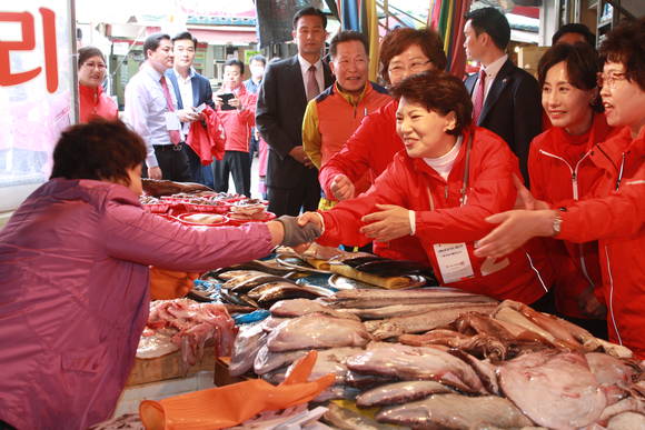 이 여사는 시장 상인들과 손을 잡고 "자유대한민국을 이끌어갈 유일한 대통령은 오직 홍준표 후보 뿐"이라며 "소중한 한 표를 행사해 달라"고 호소했다.