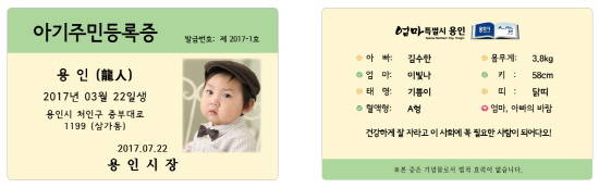 용인시 관계자는 "저출산 시대에 가족과 사회에 큰 축복인 아기의 탄생을 함께 축하하고 출산장려 분위기를 조성하려고 아기 주민등록증을 발급키로 했다"고 설명했다.