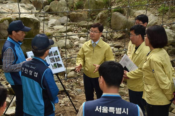 [프라임경제] 신원섭 산림청장(가운데)이 11일 서울시 관악구 대학동 관악산 계곡 산사태 취약지역을 찾아 토석류 유실 예방을 위한 사방시설(고강도 유연성 네트)을 점검했다.