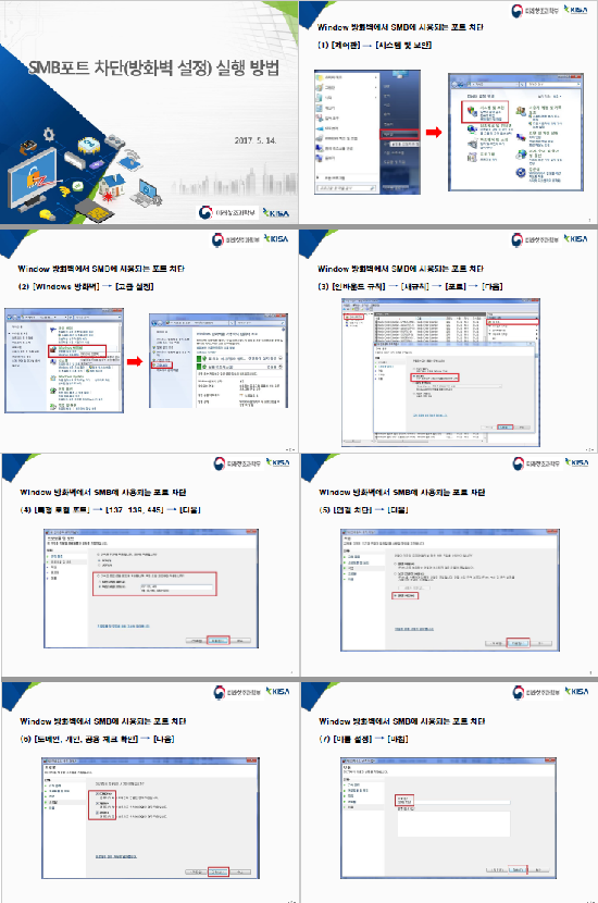 일반 사용자는 윈도우 보안패치가 안된 경우 △컴퓨터 부팅전 인터넷을 차단하고(랜선 연결 제거) △SMB 포트를 차단한 후(프로토콜 비활성화) △인터넷에 연결해 윈도우 보안패치 및 백신 업데이트 등의 순서로 진행하면 추가적 감염 피해를 막을 수 있다.