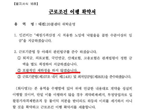KT가 직접 운영해야 한다는 내용은 대전시가 요구한 '근로조건 이행 확약서'에 명확히 기재됐다. 확약서는 인건비 지급과 근로기준법 준수, 최저임금법 준수, 포괄적 재하청을 금하는 내용을 담고 있다.