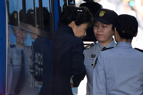미결수(법적 판결 나지 않은 상태로 구금된 형사 피고인나 피의자)인 박근혜 전 대통령은 올림머리에 수의가 아닌 사복 차림으로 재판에 출석했다. 아울러 포승줄은 하지 않았으나, 구속된 신분인 만큼 수갑을 차고 왼쪽 가슴에 '503'이라는 수용자번호 배지를 착용한 모습이었다.
