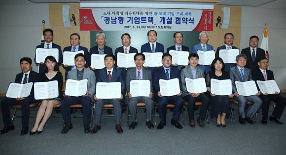 류순현 경남도지사 권한대행은 23일 도내 우량기업인 세방전지, 삼건세기, 켄코아에어로스페이스, 피앤엘, 한국앰코패키징 등과 9개 대학 50여명이 참석한 가운데 '경남형 기업트랙 협약식'을 가졌다.