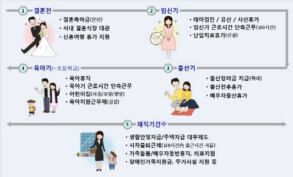 ‘난임치료휴가’는 임신에 어려움을 겪고 있는 직원들이 인공수정 등 난임치료를 위해 신청할 수 있는 휴가로 연 최대 5일 까지 사용 가능하고, 경제적 어려움과 육아 부담으로 인해 자녀 낳기를 기피하는 현실을 감안해 ‘출산장려금’을 첫째는 100만원으로 증액하고 둘째 이상은 500만원으로 늘렸다. 또한 올 7월부터는 완전자율 출퇴근제, 전환형 시간선택제, 직무공유제 등 개인 여건에 맞게 근무할수 있는 ‘육아지원근무제’가 운영할 계획이다.