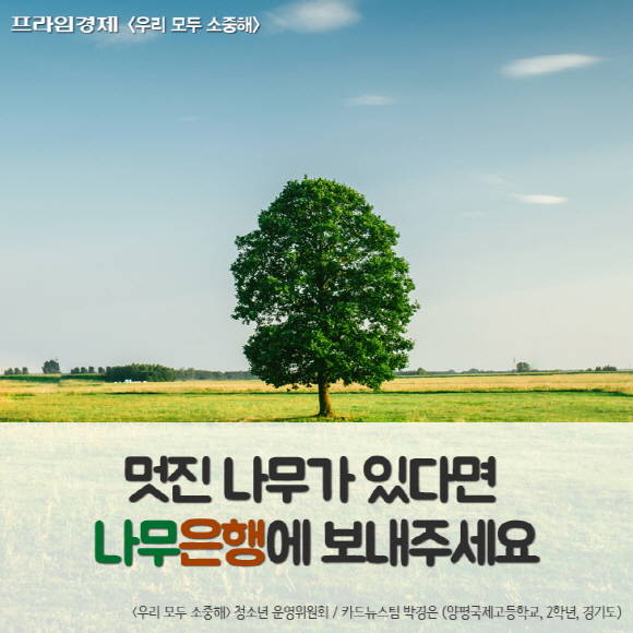 [프라임경제] '우리 모두 소중해' 캠페인의 재능기부 편집위원으로 참여하는 청소년 학생들은 발달장애인들의 감수를 거친 [우리모두뉴스] 기사를 [카드뉴스]로도 제작합니다. 이번에는 양평국제고등학교 3학년 박경은 학생이 '멋진 나무가 있다면 나무은행에 보내주세요' 기사를 카드뉴스로 제작했습니다.