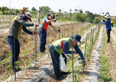일손돕기 첫 날인 25일 친환경농산과 직원 20여명이 학교면 죽정리의 한 다문화가정을 찾아 고추 지지대를 박는 일을 도왔다.