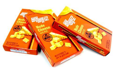 누드치즈빼빼로는 치즈를 즐겨 먹는 1020세대를 겨냥한 제품이다. 스틱 비스킷 속에 덴마크산 체다치즈를 넣어 치즈비스킷 맛을 느낄 수 있다.