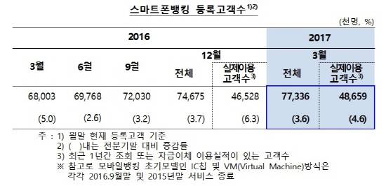 30일 한국은행이 발표한 '2017년 1분기 국내 인터넷뱅킹서비스 이용현황'에 따르면 올해 3월 말 현재 전체 인터넷뱅킹 등록고객은 1억2532만명으로 이 중 스마트폰뱅킹 등록고객이 61.7% 수준인 7734만명을 차지했다.