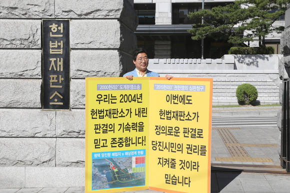 [프라임경제]김홍장 당진시장이 지난 2일 서울 헌법재판소 앞에서 당진땅찾기범시민대책위원회의 1인 피켓시위 활동에 동참했다.