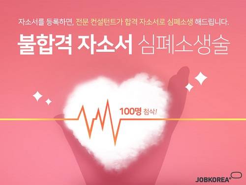 취업포털 잡코리아(대표 윤병준)는 전문 컨설턴트의 자소서 컨설팅을 받을 수 있는 '불합격 자소서 심폐소생술' 이벤트를 잡코리아 회원들을 대상으로 진행한다고 5일 밝혔다.