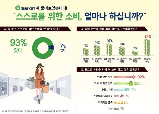 9일 G마켓에 따르면 지난달 31일부터 이달 6일까지 일주일간 총 946명의 고객을 대상으로 '나를 위한 소비' 관련 설문을 실시한 결과, 93%가 '올해 들어 본인을 위한 소비를 했다'고 답했다. 10명 중 9명은 온전히 자신만을 위한 소비를 즐기고 있는 것.