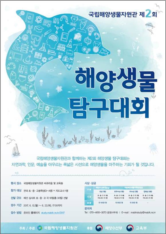 http://study.mabik.re.kr/2017)을 통해 신청할 수 있으며, 궁금한 점은 대회 운영 사무국(070-4610-3073)으로 문의하면 된다. 지난해 1회 대회에는 총 256개팀이 참여하여 28팀이 수상했다. 지난해 수상작들은 국립해양생물자원관 누리집(www.mabik.re.kr) 교육 참가 게시판에서 확인할 수 있다.