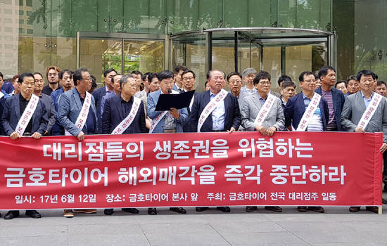 금호타이어 전국 대리점 점주 100여명은 12일 오후 서울 광화문 금호아시아나 본관 1층 정문 앞에서 금호타이어의 더블스타 매각반대를 주장했다.