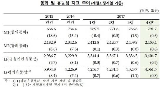 한국은행(한은)이 13일 발표한 '2017년 4월 중 통화 및 유동성' 자료를 보면 지난 4월 광의통화(M2)는 2453조4000억원으로 전년동월대비 6.6% 증가했다. 작년 3월 소폭 상승세를 보인 이후 오름세는 유지됐으나 지난해 4월(7.0%)과 비교하면 증가 폭이 다소 둔화됐다.