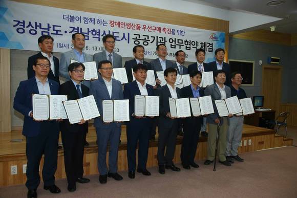 [프라임경제] 경남도는 지난 13일 진주서부청사에서 장애인의 소득향상과 일자리 개선을 위해 경남혁신도시 공공기관(11개), 장애인생산품 단체가 중증장애인생산품 구매 확대 업무협약을 체결했다.