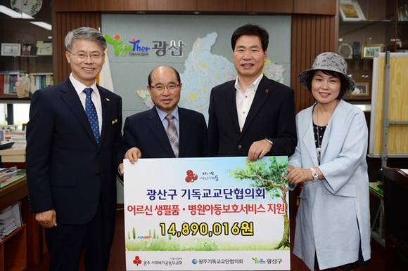 14일 광주광역시 광산구청장실에서 이장헌 광산구기독교단협의회장, 조광수 (사)광주디아코니아 사무총장, 김상균 사회복지공동모금회 광주지회사무처장, 김은아 엄마손길협동조합 대표, 민형배 구청장 등이 참석한 가운데 광산구기독교단협의회가 사회복지공동모금회에 1489만원을 기탁했다.
