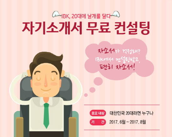 [프라임경제] IBK기업은행이 8월 말까지 기업은행을 거래하는 20대 취업준비생을 대상으로 자기소개서를 무료로 컨설팅해주는 이벤트를 진행한다.